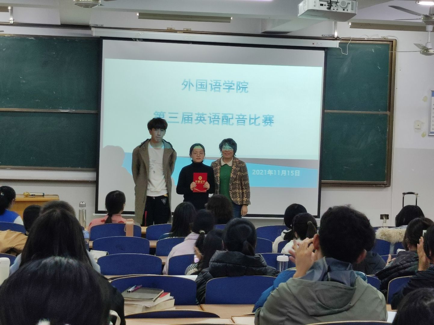 比赛开始前,学生会工作人员提前布置场地,进行多媒体设备的调试,并引导各位评委老师、比赛选手和观众有序入场。比赛开始时,由主持人宣布比赛规则及流程,各组参赛选手有序上台进行比赛,各组配音展示后由评委老师对小组表现进行点评,提出相关建议并进行打分,并由工作人员核算各组得分。经过一下午的视听盛宴,最终由主持人宣布比赛结果:《爱丽丝梦游仙境》组杨紫坤等人,《疯狂动物城》组刘明轩等人荣获一等奖,《寻梦环游记》《功夫熊猫》等组荣获二等奖,《疯狂动物城》《飞屋环游记》《灰姑娘》等组荣获三等奖,评委为获奖小组颁发荣誉证书。