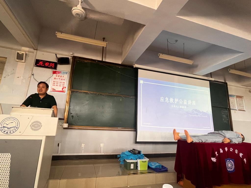 公安医院徐俊祥院长深入浅出地讲解了日常面对昏迷、溺水、气道异物梗阻等突发状况时如何开展急救。讲座中,他强调了“4分钟黄金救助时间”的概念,并列举一些由于没有及时救治或救治不当造成的悲剧,强调了在日常生活中急救的重要性。通过现场场景模拟实操,让大家掌握了患者评估、胸外按压、气道开放、人工呼吸等基本流程以及“用力压、快速按、不间断”的心脏复苏要领。随后,指导师生借助硅胶模特进行了心脏复苏急救模拟操作。随后,徐院长为大家讲授了“海姆立克”急救法。将理论知识和日常生活实例相结合,以实际操作为主,使现场的师生了解了急救的基本要领,形象生动地讲解让大家受益匪浅。