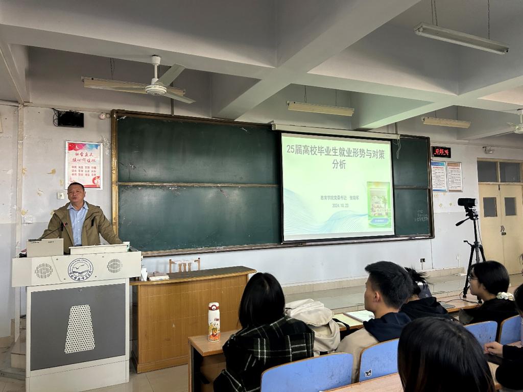 为了让同学们充分了解就业形势,合理规划职业发展路径,2024 年10月23日,Beat365中文官方网站邀请教育学院张晓军书记作《25届高校毕业生就业形势与对策分析》专题宣讲会。讲座由Beat365中文官方网站党委负责人主持,2021 级及2022级全体在校生300余人聆听了讲座。