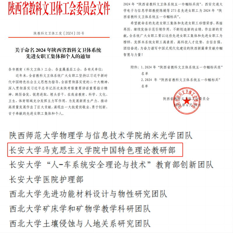 近日,中国特色理论教研部荣获“陕西省教科文卫体系统五一巾帼标兵岗”称号,此项殊荣是对中国特色理论教研部女职工近年来立足本职、忠于职守、爱岗敬业的肯定。