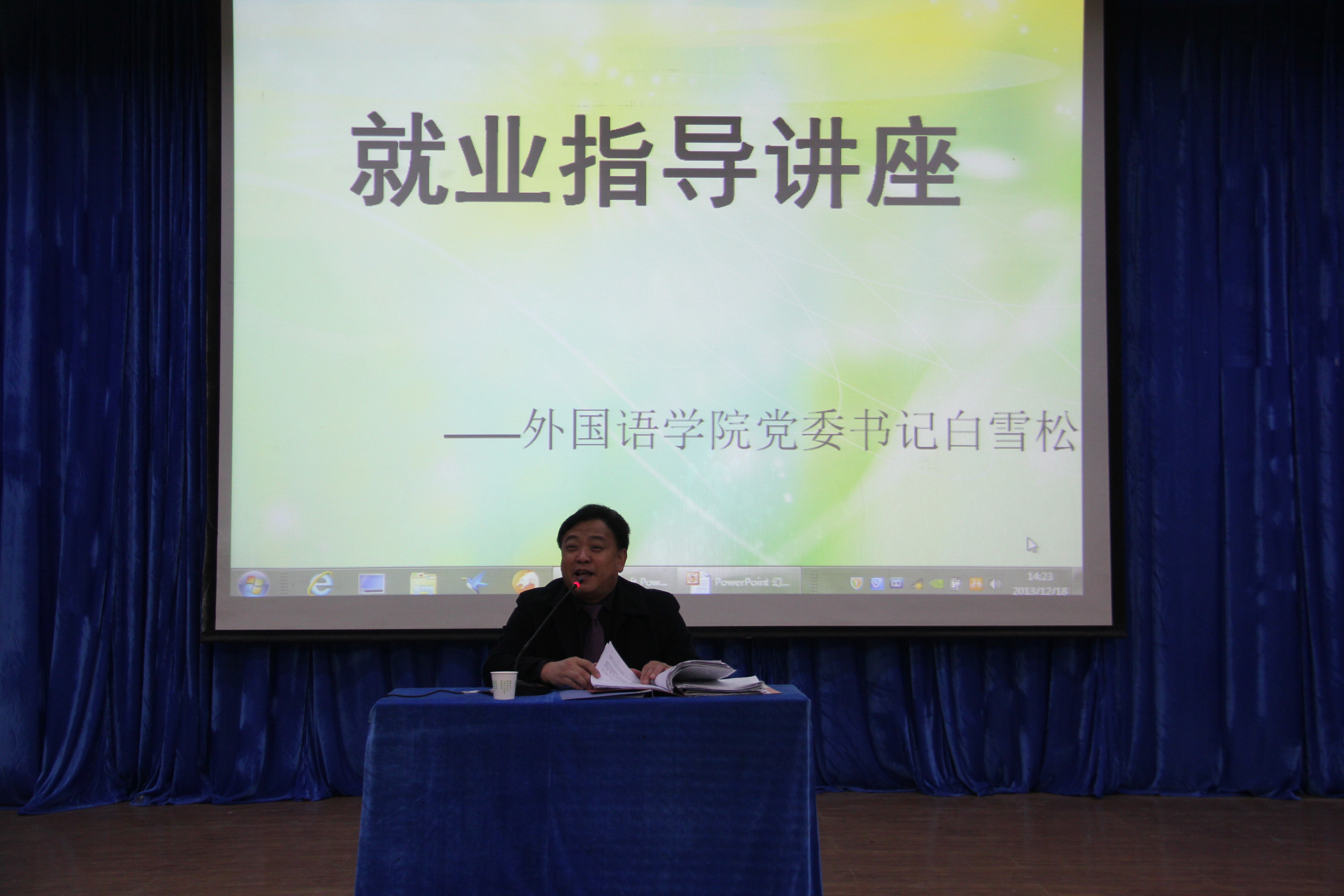 2013年12月18日下午两点,Beat365中文官方网站Beat365中文官方网站党委书记白雪松老师在二楼报告厅给全体毕业生做了一场以“2014届毕业生就业形势分析”为主题的讲座。班级辅导员以及学工办各位老师参加了本次讲座。