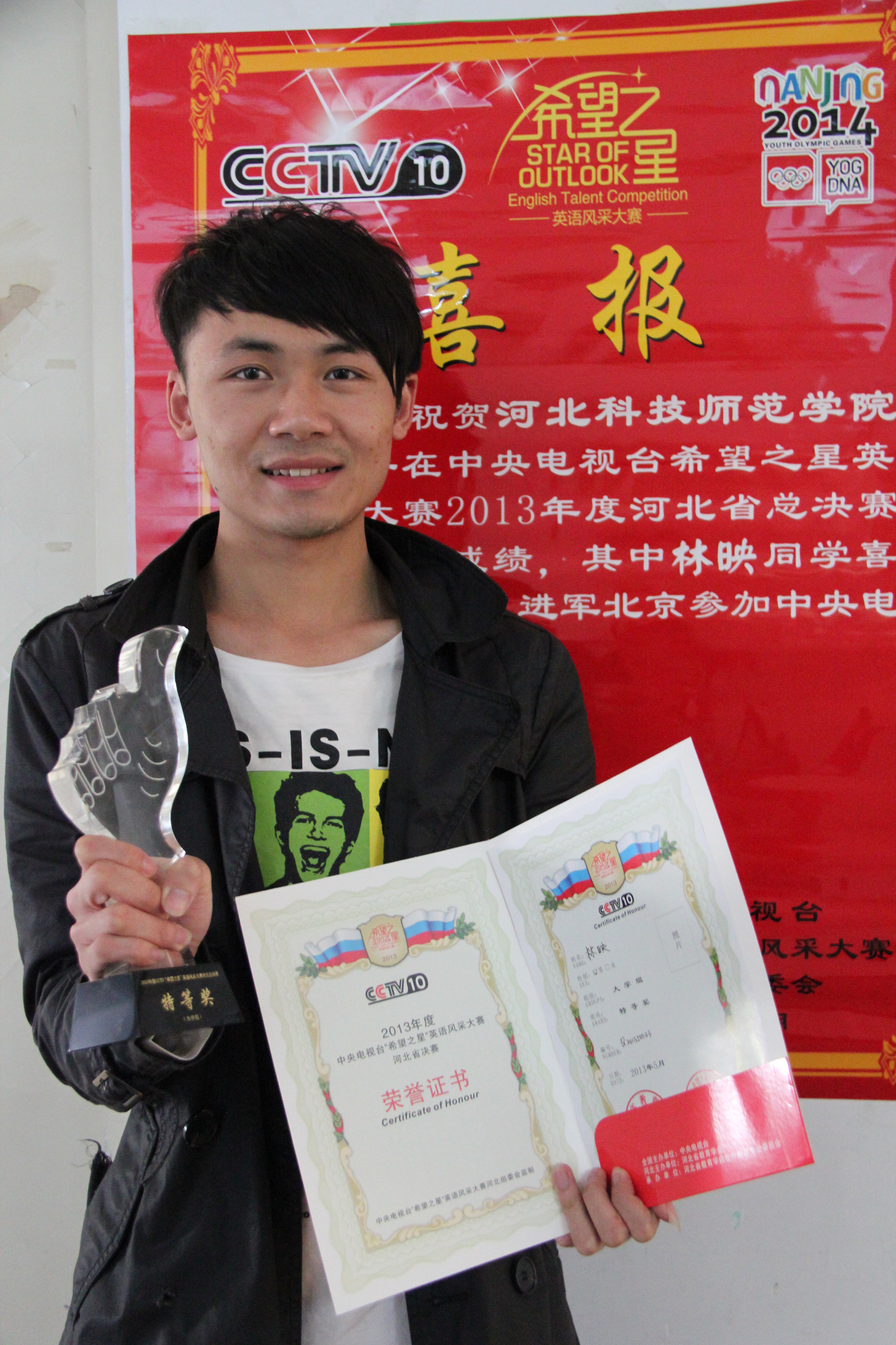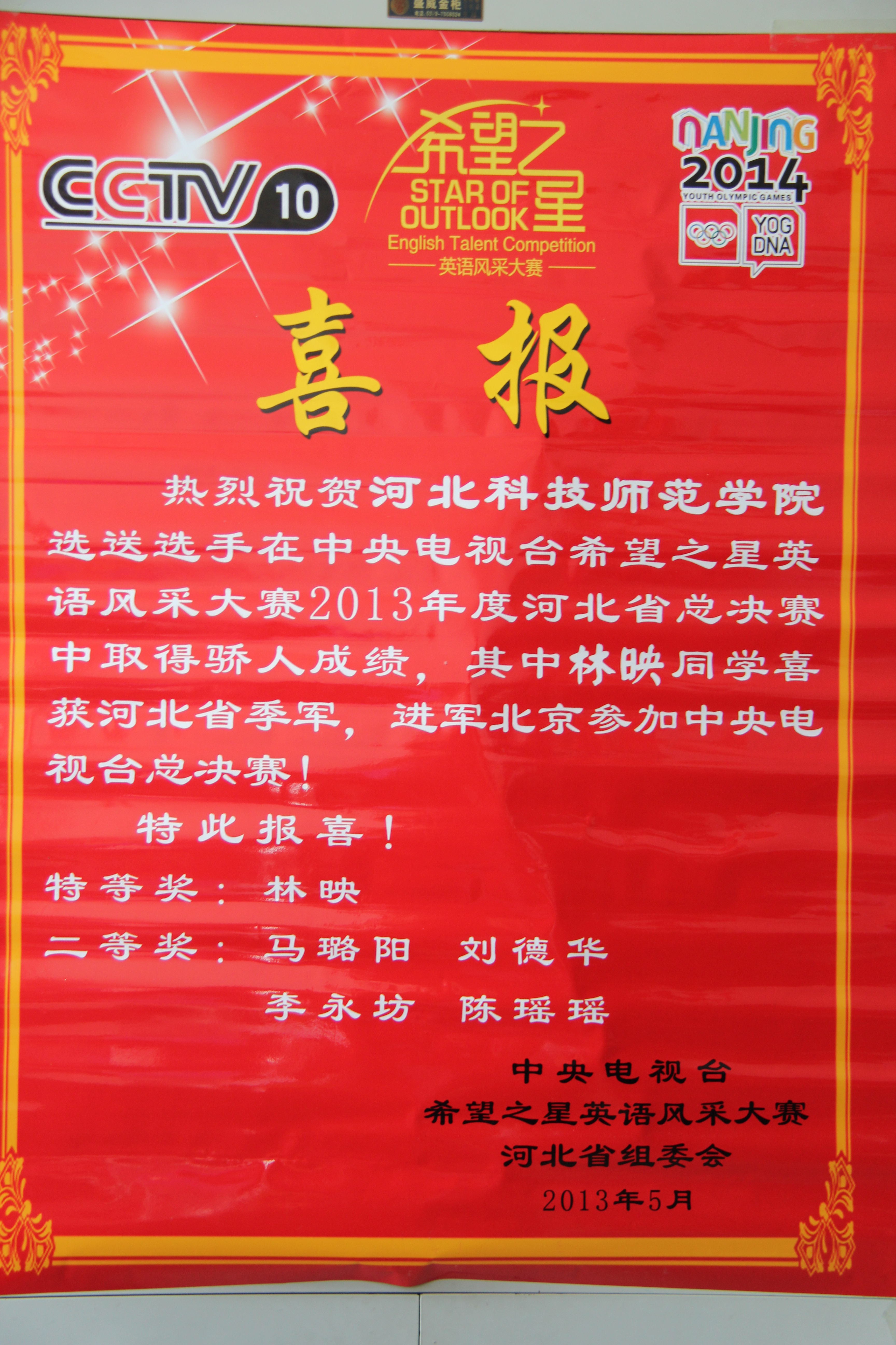 Beat365官网选手在河北省希望之星英语风采大赛总决赛中表现优异,其中Beat365中文官方网站学生林映获得河北省季军,将进军北京中央电视台参加总决赛。另有马璐阳、刘德华、李永坊、陈瑶瑶四名同学获得二等奖。