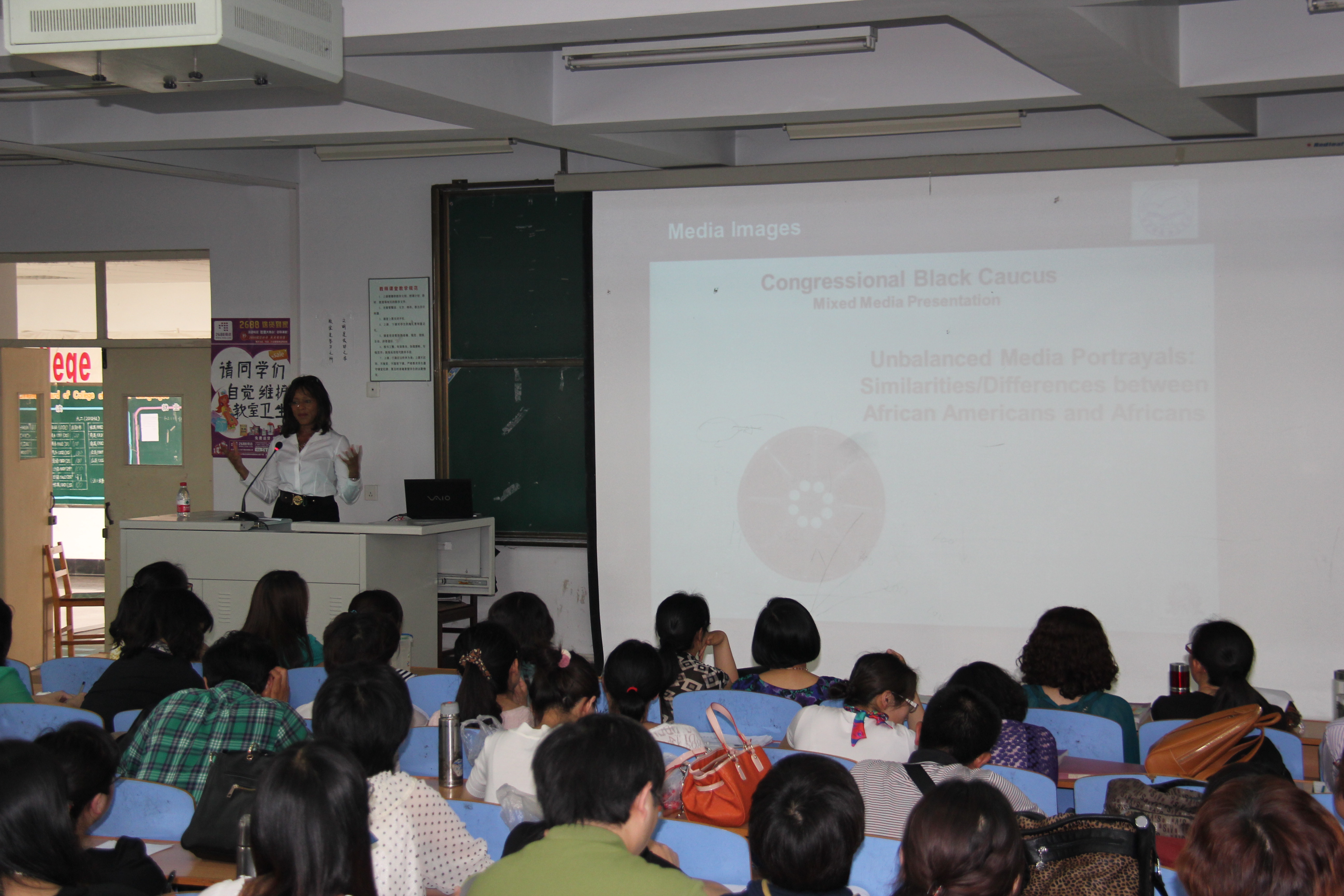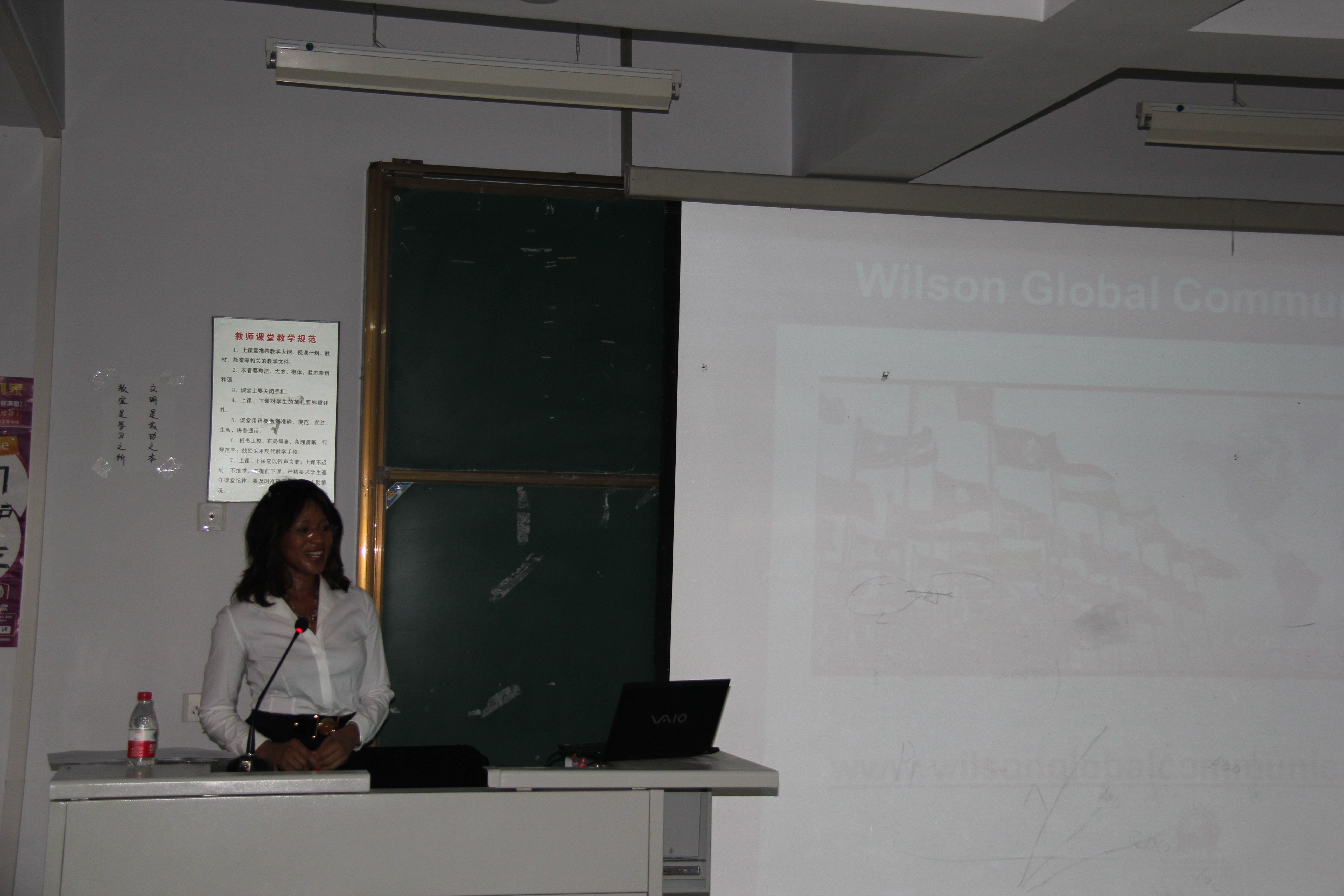 6月7日,美国富尔布莱特奖获得者茱莉亚·威尔逊女士在开发区校区为Beat365中文官方网站的师生们做了一场关于全球化背景下如何加强交流的讲座。国际合作与交流处处长兼国际交流中心主任东方阳,副处长、副主任孙学文,Beat365中文官方网站院长邵丽君,副院长游建民,副院长崔海英和Beat365中文官方网站的教师及英本10级的学生们现场聆听了讲座。