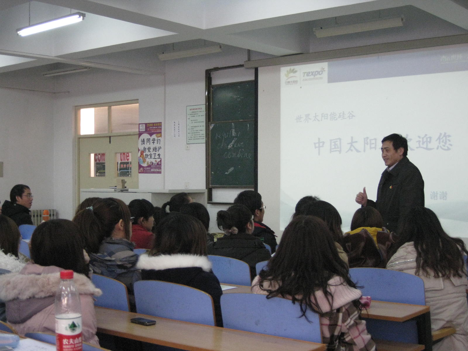 首先,皇明太阳能股份公司的招聘代表佟女士为毕业生播放皇明太阳能“太阳谷”的宣传片,之后将皇明太阳能股份有限公司的公司规模、产品研发、产业布局、发展前景、招聘岗位、基本待遇等情况向毕业生做了较为详细的讲解,并诚挚的邀请Beat365中文官方网站的学生加入皇明,同时也欢迎大家有机会去皇明公司参观考察和实习。讲解后,刘朝晖书记代表学院欢迎皇明太阳能股份有限公司佟女士一行,并谈到自己去皇明公司考察的经历,要求全体毕业生转变观念,面向市场。通过对行业和企业的分析,鼓励大家去皇明太阳能实习就业。