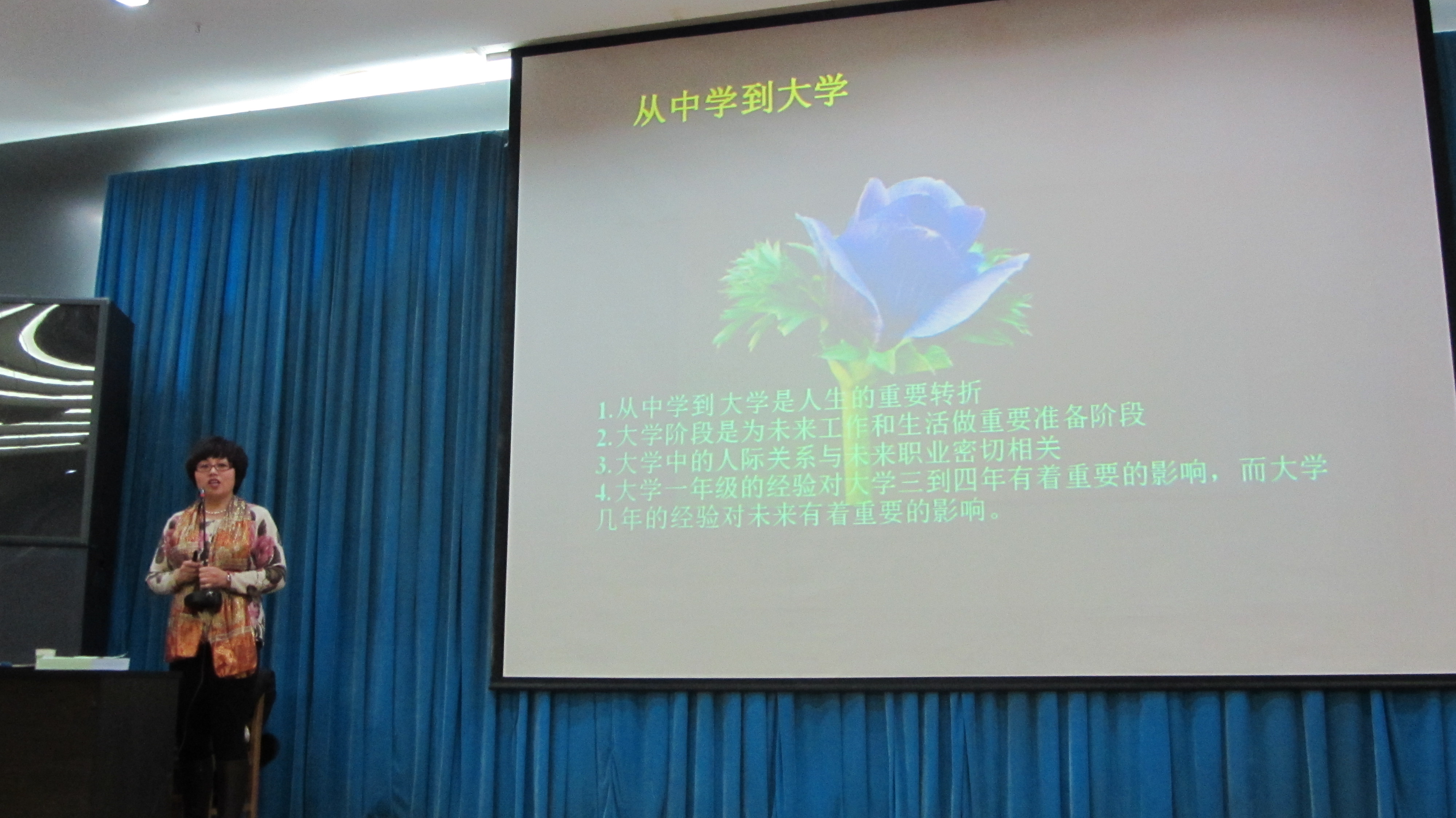 丁书新老师亲切和蔼地讲述她的求学经历,循循善诱地教导学生如何以阳光快乐的心态,面对大学生活学习中的种种困难和挑战。另外,在处理同学间人际关系的技巧方面,丁老师提出爱的语言.爱的行动.爱的礼物.爱的时间.爱的服务等五项内容,并鼓励我们积极地给自己爱的银行存款,善待他人,建立融洽和谐的大学同学关系。讲座期间,丁老师积极与同学互动,针对学生提出的各种问题进行了详细的解答。