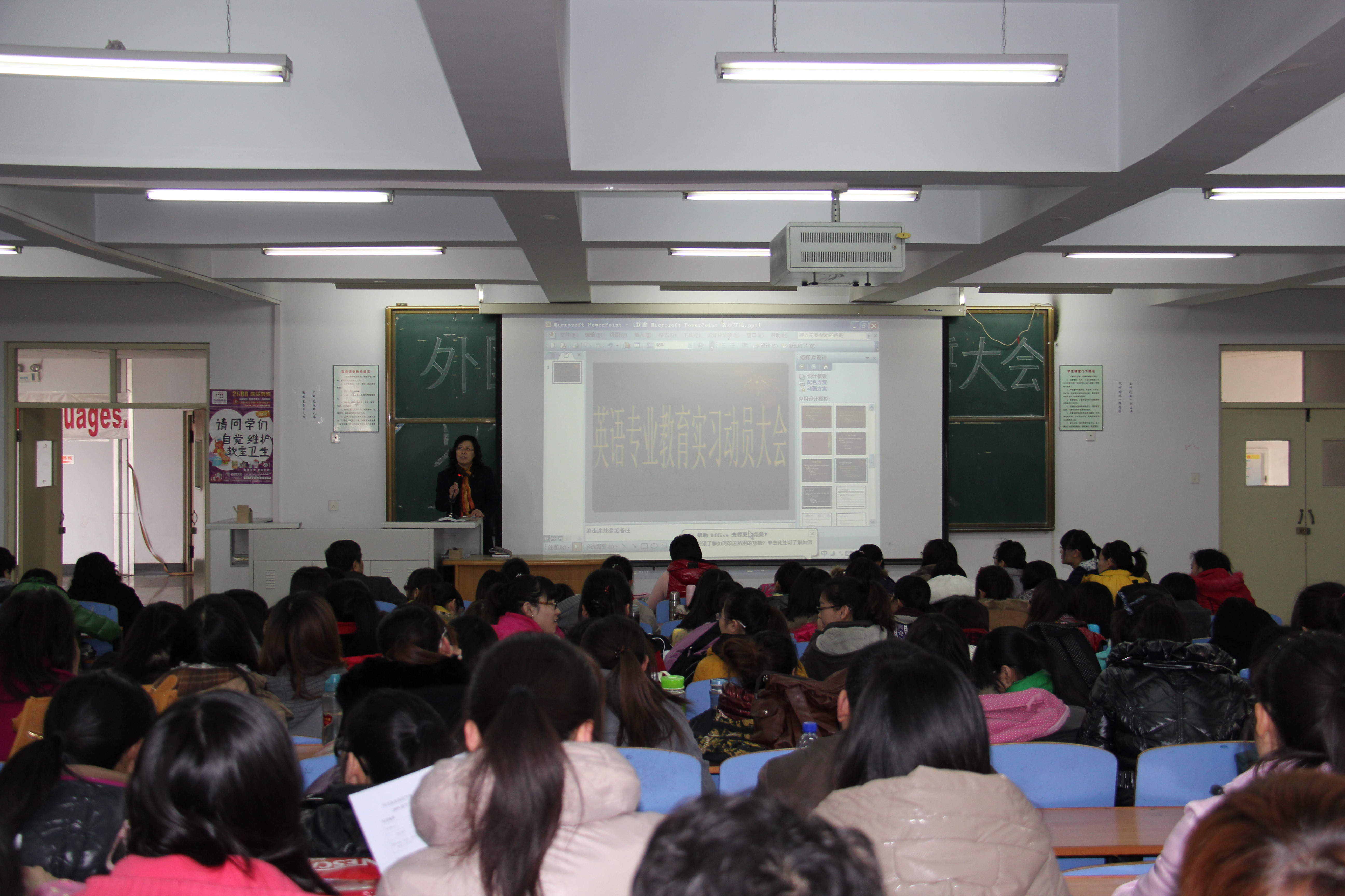 Beat365中文官方网站英语专业教育实习动员大会于2012年3月22日在开发区校区举行。参加此次教育实习动员大会的有学院党委书记刘朝晖书记、副院长游建民教授、副院长崔海英副教授、英本教研室主任范学荣副教授、旅游英语教研室主任罗学锋副教授、英语本科教研室的教师们和09级英本和11级英语专接本的同学们。Beat365中文官方网站院长邵丽君教授主持了此次大会。