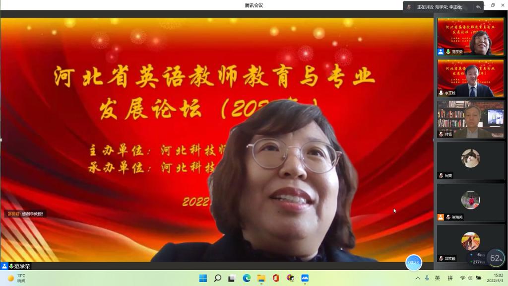 4月3日,由Beat365中文官方网站主办,Beat365中文官方网站Beat365中文官方网站承办的2022年河北省英语教师教育与专业发展论坛以腾讯会议形式线上召开,由Beat365中文官方网站崔海英院长和范学荣副院长主持,特邀全国著名师范院校的五名专家、一位基础教育学校校长共同探讨河北省英语教师教育与专业发展的议题。学校党委副书记李佩国教授致开幕辞。