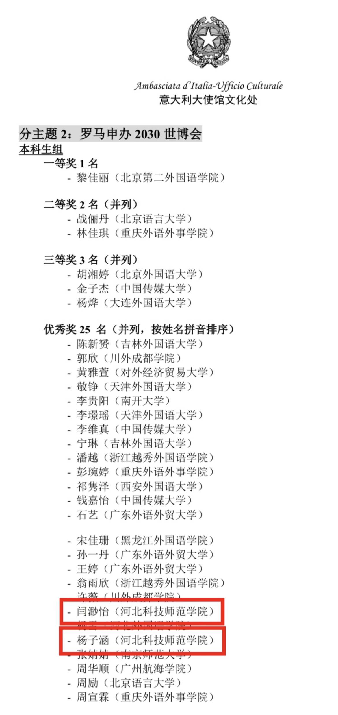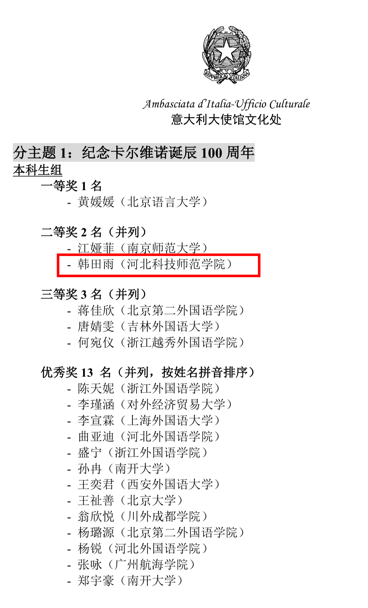 近日,2023年第八届全国“ITALIA CIAO/意大利语桥”大赛圆满落幕,本届大赛的总主题为:意大利语与可持续性,下设“纪念卡尔维诺诞辰100周年”与“罗马申办2030世博会”两个分主题,以写作大赛的形式举行。本次比赛有来自北京外国语大学、上海外国语大学、广东外语外贸大学、南开大学等23所高校的74名学生参赛(其中本科生组50名,硕士生组24名)。Beat365官网选手韩田雨同学,凭借扎实的意大利语专业能力,荣获本科生组二等奖。Beat365官网另外两名选手闫渺怡、杨子涵获得优秀奖。