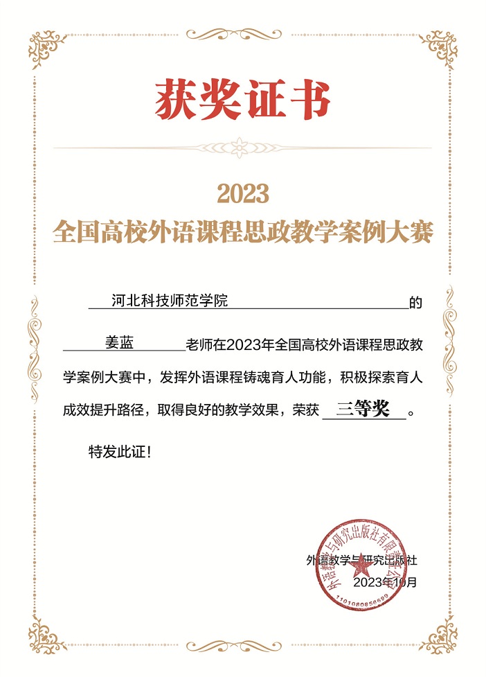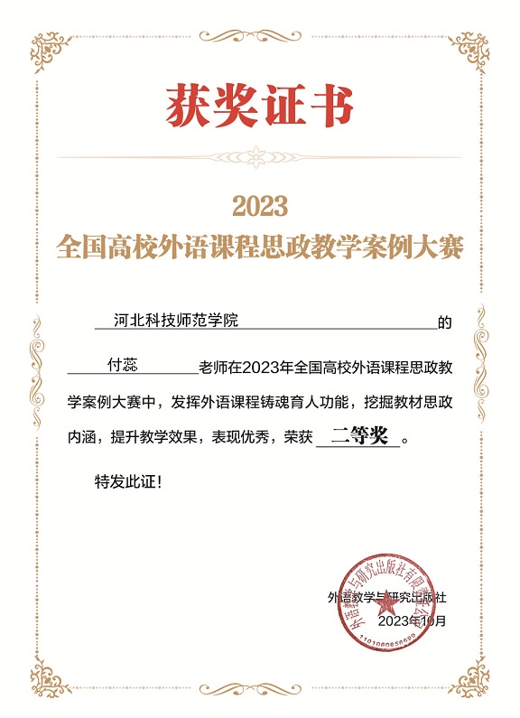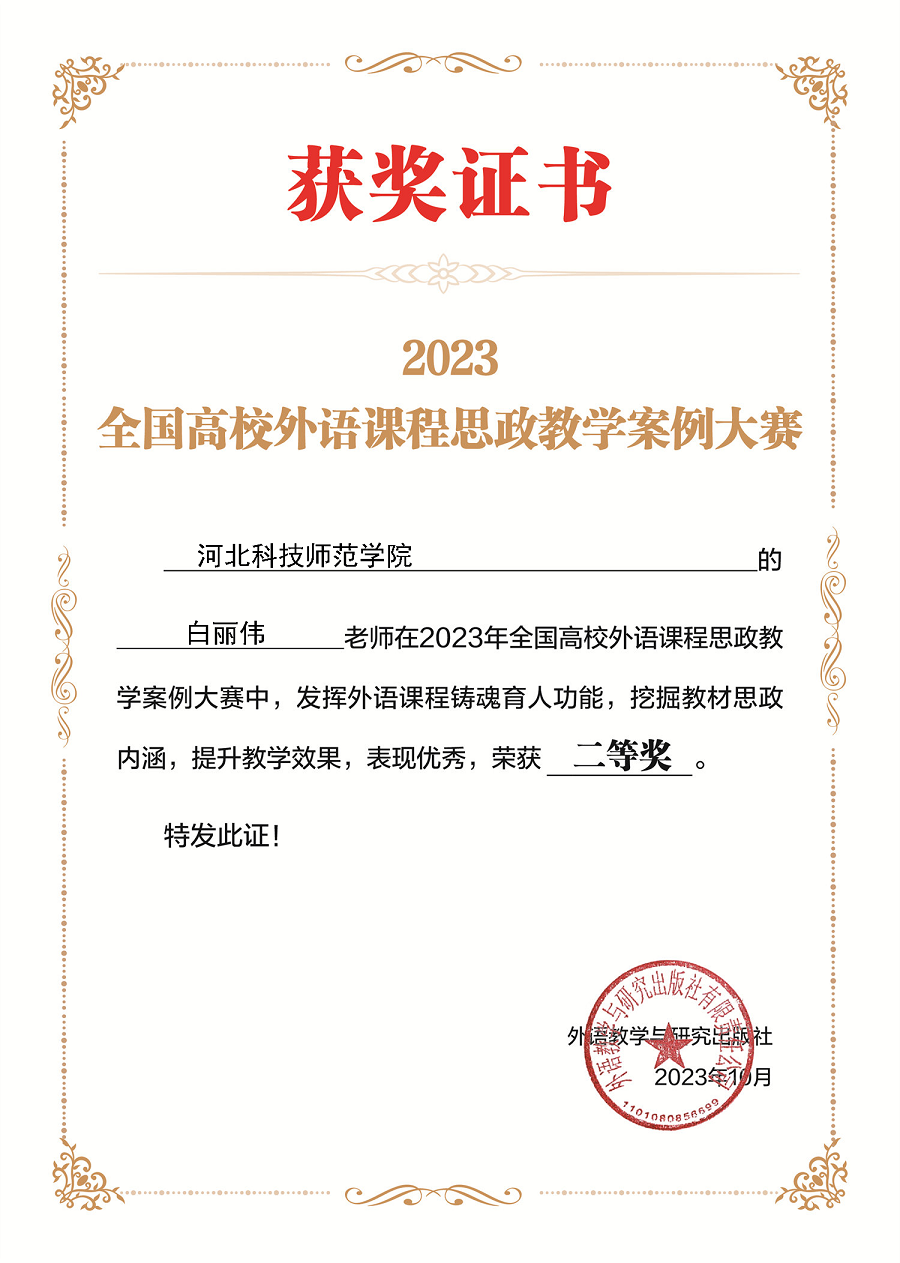 近日,2023年全国高校外语课程思政教学案例大赛落下帷幕,全国2000余名教师参赛,经过资格审查和通讯评审,Beat365官网4名教师脱颖而出,白丽伟、付蕊、高洁老师荣获二等奖,姜蓝老师荣获三等奖,同时获得数额不等的教师研修基金。