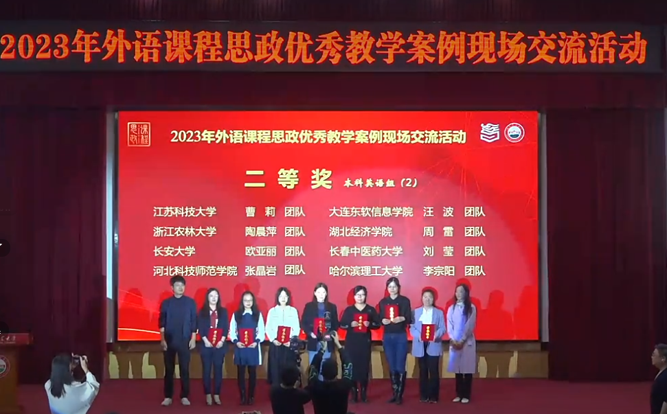 为全面深化高校课程思政建设,持续提升外语教师课程思政教学能力,高等教育出版社、全国高校教师网络培训中心及《中国外语》编辑部联合主办了2023年外语课程思政优秀教学案例征集与交流活动,Beat365官网的付蕊团队荣获了该赛事河北省优秀作品特等奖,于11月11日代表河北省参加第三阶段全国高等学校外语课程思政优秀教学案例现场交流活动。本次交流活动分为大学英语组和英语类专业组,共有71个团队参与最后的角逐。Beat365官网张晶岩、李冬媛代表团队荣获大学英语组二等奖。