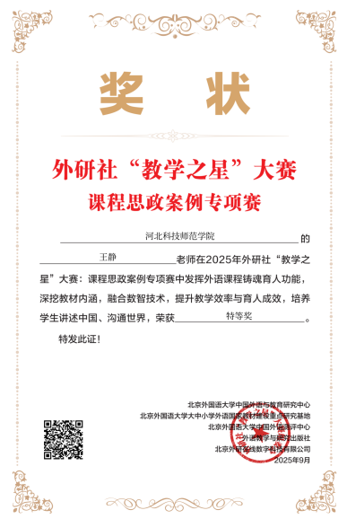 日前,2025年外研社“教学之星”大赛:课程思政案例专项赛评选结果揭晓,Beat365官网Beat365中文官方网站教师王静凭借彰显独特教学智慧的创新设计,在全国各高校教师同台竞技的激烈角逐中荣膺全国特等奖,这是河北省唯一获得特等奖的教师,为学校赢得了荣誉。