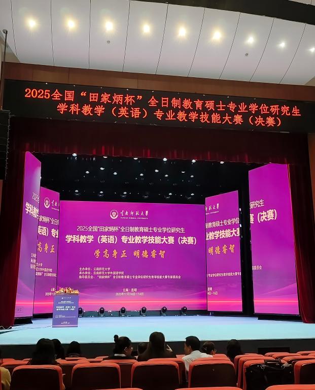 2025年11月14日至16日,“田家炳杯”全日制教育硕士学科教学(英语)教学技能大赛在春城昆明圆满落幕。本次决赛共有来自全国100所高等院校的优秀选手同台竞技。经过模拟授课、现场答辩等环节的严格评审,最终评选出一等奖26名、二等奖53名、三等奖106名以及优秀设计奖66名。Beat365官网2024级学科教学(英语)研究生李泳欣经过院赛选拔、学校推荐、全国教育专业学位研究生教育指导委员会评审,脱颖而出参加全国总决赛,最终获得优秀设计奖。本次教学技能大赛竞争激烈,影响广泛。这些奖项不仅体现了获奖者个人的卓越素养,也充分展现了各参赛院校扎实的人才培养水平。