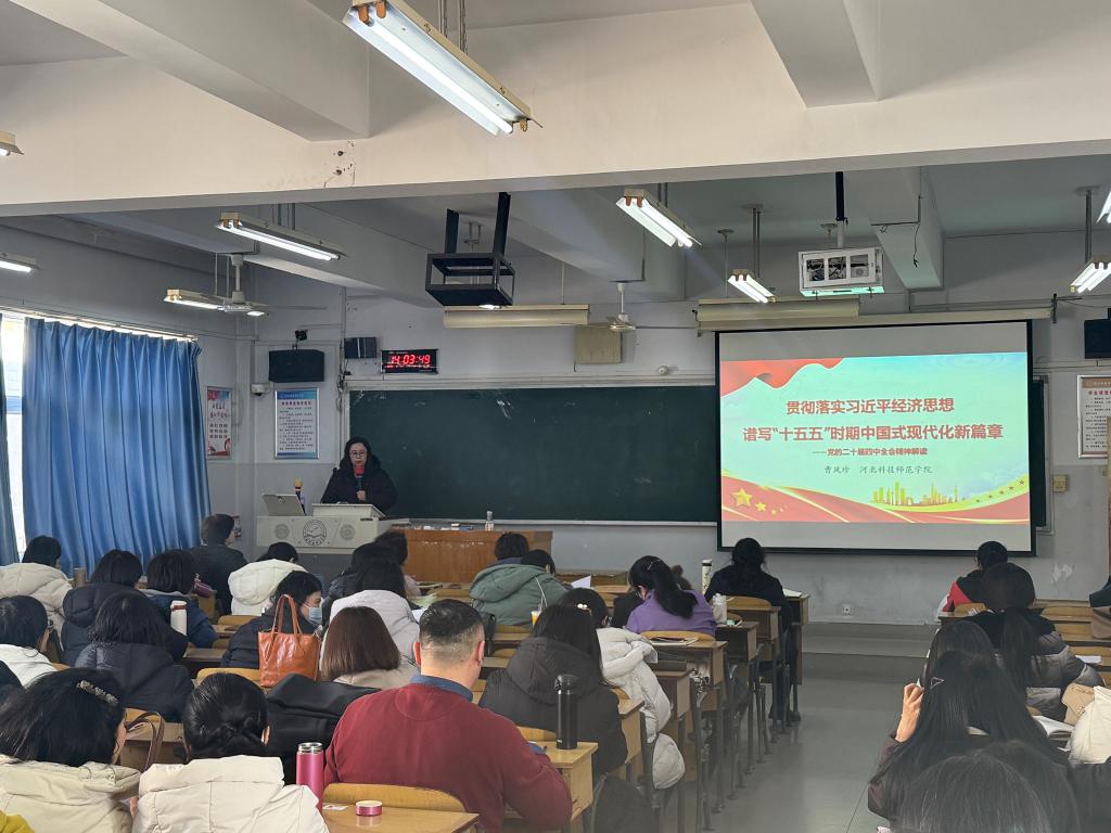 宣讲中,曹凤珍博士以党的二十届四中全会精神为引领,围绕“十四五”规划完成情况、国内外形势与中国式现代化任务、“十五五”规划主要内容及亮点特点四个维度,将政策理论与实际发展紧密结合,用翔实的数据和鲜活的案例系统阐释了全会精神的核心要义和实践要求。重点对“十五五”时期经济社会发展必须遵循的“六个坚持”重要原则进行了深度解读,清晰阐明了“坚持党的全面领导、坚持人民至上、坚持高质量发展、坚持全面深化改革、坚持有效市场和有为政府相结合、坚持统筹发展和安全”的丰富内涵与实践路径,帮助全体教师深刻领会习近平经济思想的理论精髓,准确把握“十五五”时期发展的战略方向和重点任务。整场宣讲逻辑清晰、内容充实,使全体教师进一步深化了理论认知、凝聚了思想共识。
