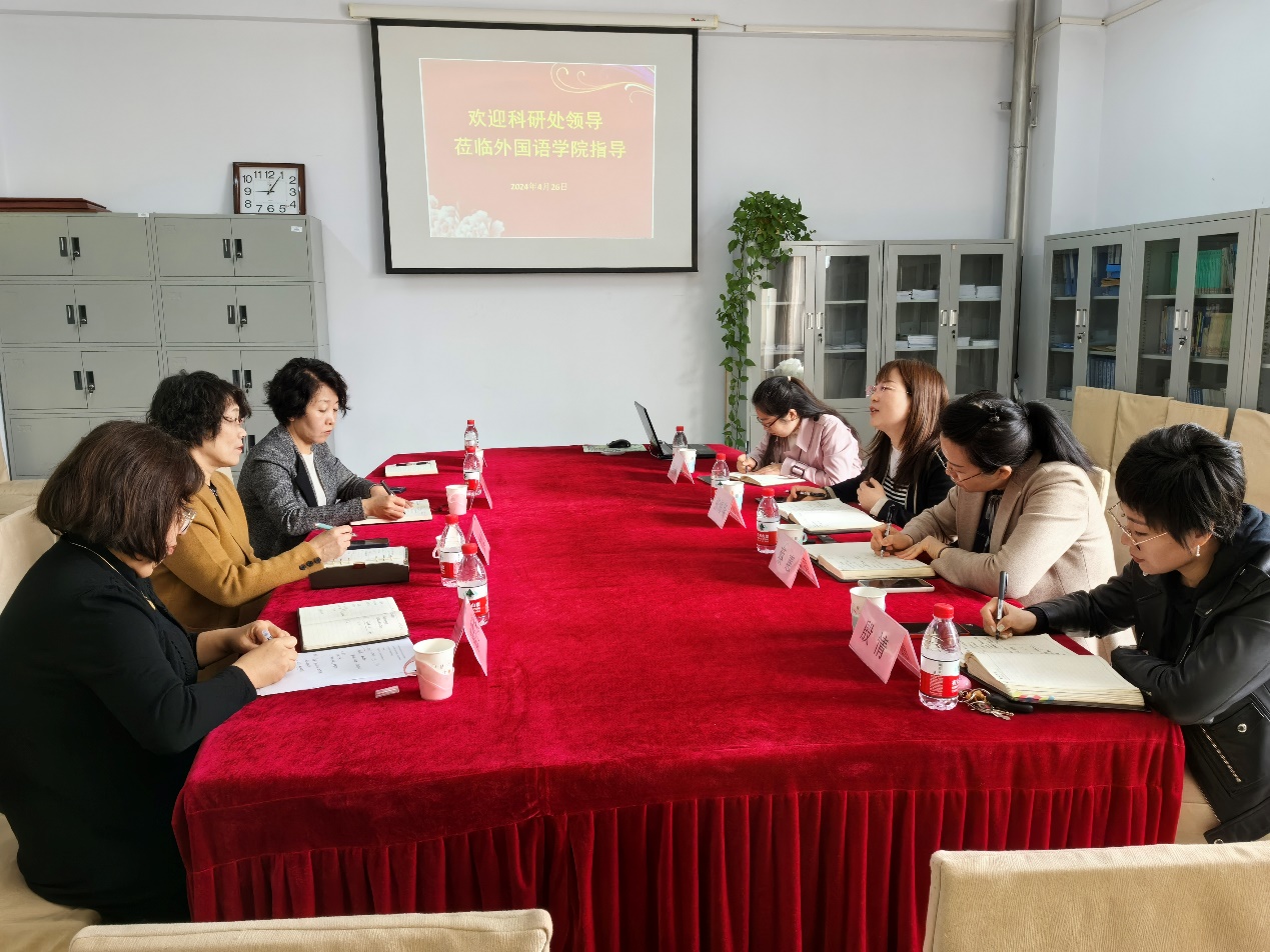 2024年4月26日上午,学校科研处处长张海华、副处长蔡惠、科长张娟和殷情四位同志莅临Beat365官网开展工作调研。Beat365官网党委书记范群英、院长崔海英、副院长范学荣及学科秘书刘洋洋出席座谈会。